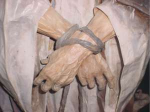 Desde los anchos cantos de la túnica salen los delgados y arrugados brazos con venas pronunciadas. La mano izquierda, tensa reposa sobre la derecha que se encuentra relajada y están atadas a nivel de las muñecas con una cuerda grisácea.