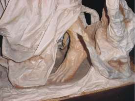 El personaje está desprovisto de calzado, endosa una túnica de color blanco, vieja y ennegrecida, cubierta en parte por un manto marrón-purpura. La larga túnica, conformada por pliegues verticales que se adaptan con soltura al cuerpo, adquiere una forma rugosa y ondulada a partir de las rodillas, dejando al descubierto parte de la pierna y el pie derecho, visto el personaje desde el lado lateral derecho la pierna tensa avanza y se sujeta a la enramada; mientras que desde el ángulo izquierdo la pierna portante queda al descubierto a nivel del tobillo y el pie inclinado apoya los dedos en el suelo y el talón en la enramada para sugerir movimiento y estabilidad. (Fig. 2 y 3).