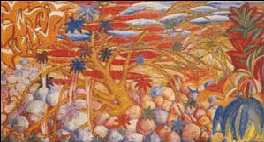 gallo" el color estalla en la tela. Amarillos, ocres, naranjas, verdes y rojos se desbordan en la retina del